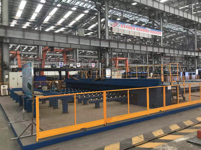 該設(shè)備主要由龍門綜合拼板架、物流傳送系統(tǒng)、焊接系統(tǒng)、數(shù)據(jù)監(jiān)控系統(tǒng)、集中潤滑系統(tǒng)、電氣控制系統(tǒng)、坡口機(jī)、焊接小車及電源和檢修機(jī)位手弧焊電源等組成,設(shè)備整體區(qū)域范圍10m*20m。采用正面液壓琴鍵壓緊、反面加水冷銅套襯墊成型槽的方式進(jìn)行拼板對(duì)接焊接,采用雙絲氣保焊工藝,實(shí)現(xiàn)工件單面焊雙面成型。此單面焊雙面成型焊接工藝避免了傳統(tǒng)的兩面焊工件翻身問題,節(jié)省場(chǎng)地,降低作業(yè)強(qiáng)度,提高了焊接效率,實(shí)現(xiàn)流水線焊接,該拼板單面自動(dòng)化焊接工作站各部分之間可協(xié)調(diào)動(dòng)作,采用PLC可編程序控制器集中控制方式,整體設(shè)計(jì)緊湊,自動(dòng)化程度高,便于操作。輔助機(jī)構(gòu)配置齊全,可充分發(fā)揮整機(jī)的性能。