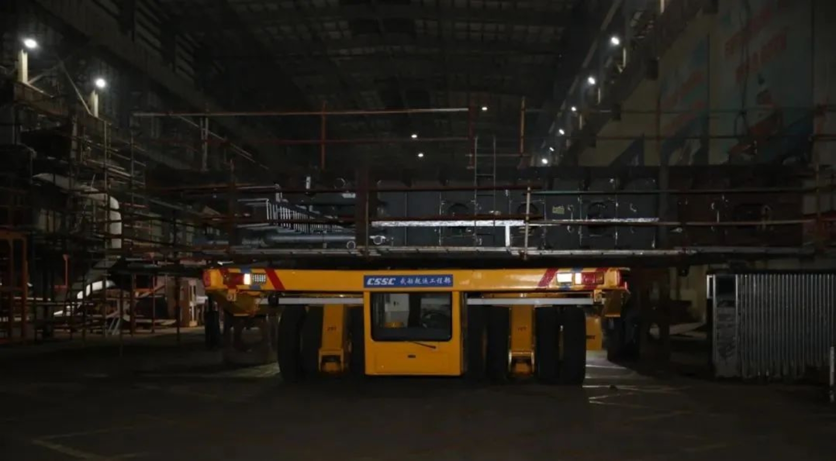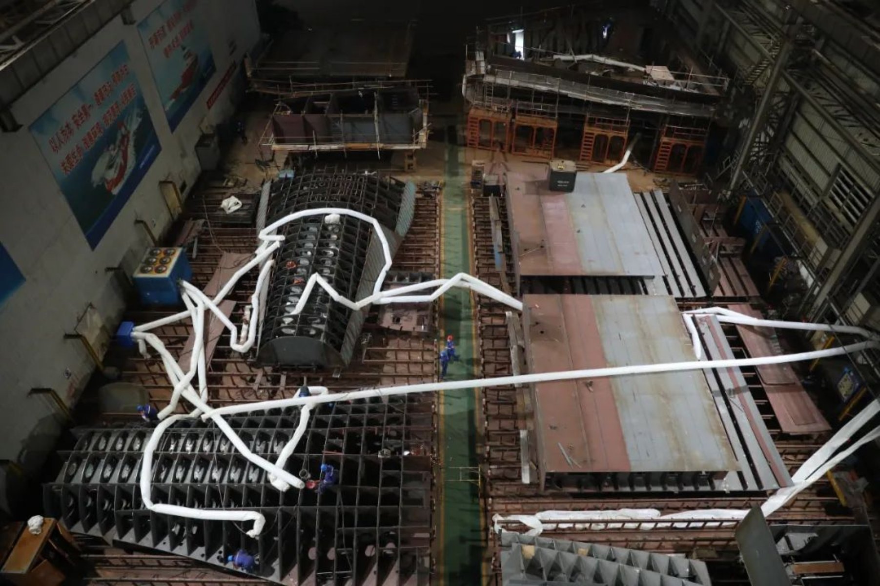 希臘1100箱集裝箱船1號船總工藝師安志杰表示:分段部結合船型特點和現有設施,以提升效率為基點,和設計人員聯動,通過提前謀劃、高效焊接、舾裝前移、即刻溝通等措施,實現了分段高效制造和完整轉序,確保了后續建造周期。