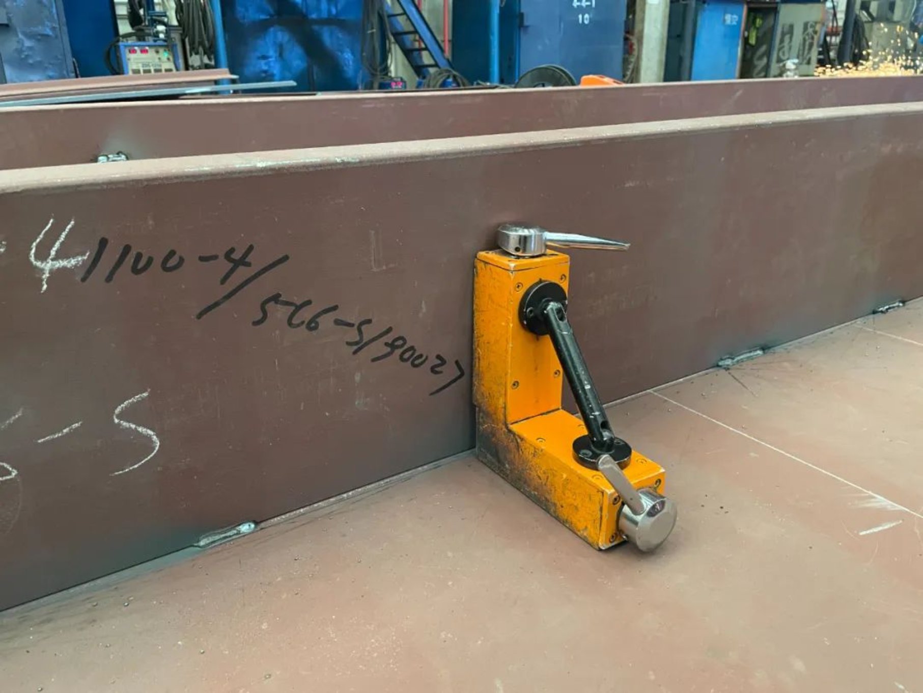 無碼工裝的使用,一直是提高配質量和生產效率的有效手段。分段部通過磁力壓碼、磁力頂碼的使用,利用磁力支架,方便對甲板型材、T型材等結構垂直度進行調整,實現拼板、甲板型材、T型材等結構的無碼裝配,節省了后續割、補、磨等無效工時,同時避免外板點焊及過度打磨留下弧坑,有效提升分段外板和整船船體外觀質量。