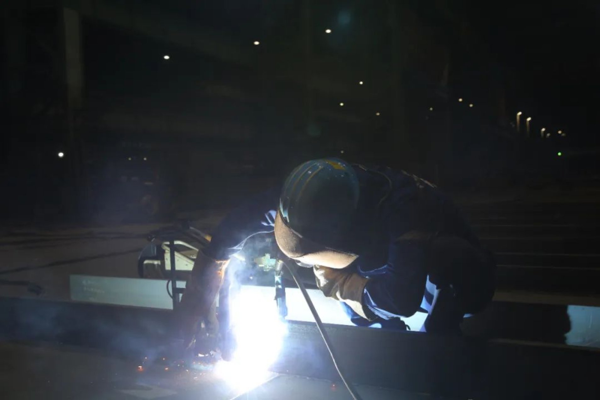 6月28日晚上7:45,室外溫度33度,六聯跨燈火通明,焊花飛舞,打磨聲、敲擊聲此起彼伏,轉運車輛正拖著分段從跨里緩緩駛出……