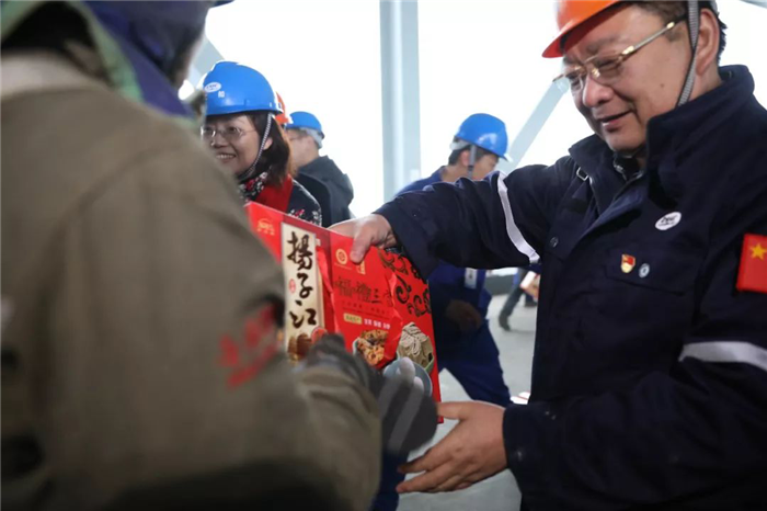 活動結束后,市總工會、武船黨委工作部、群團工作部、武船重工股份有關領導親切看望項目現場施工人員并為他們送上春節慰問品。