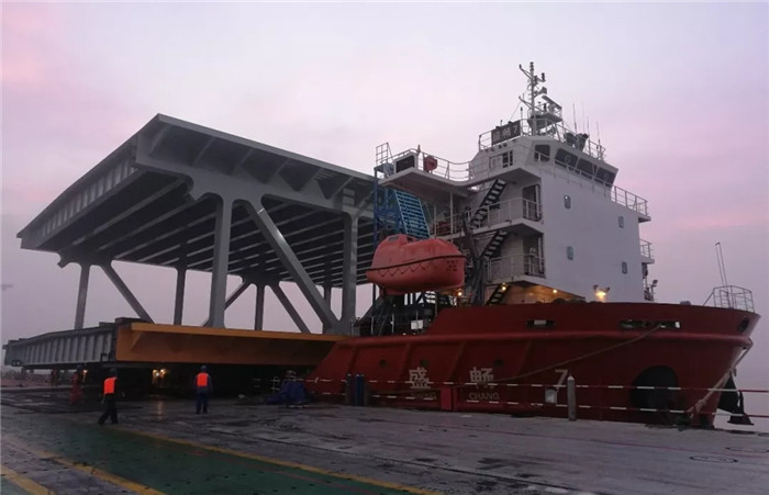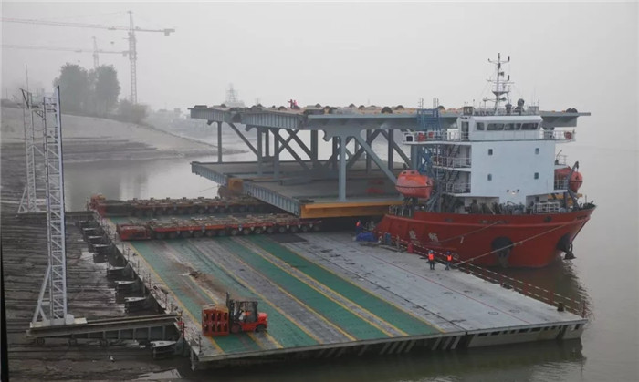 斜船架經過45分鐘的下行,滑行到達指定水域,等待的運輸船舶盛暢7#迅速起錨靠近斜船架,固定纜繩、對準搭接通道、左舷壓水,項目部、起重運輸部和雙柳公司等20余人的發運團隊各就各位,各司其職,一系列的準備工作嫻熟而利落。隨后操作人員啟動模塊車,在指揮人員的指令中,緩緩上船。3排軸線上船后,船右舷傾斜下沉,對講機中不斷傳來操作指令:斜船架1檔下行、停止、左舷繼續壓水、模塊車低速前進……,模塊車前輪越過中線后,船體逐漸向左舷復位傾斜,對講機中操作指令又不斷清晰傳來:斜船架上拉、左舷壓水停止、模塊車繼續前進……。