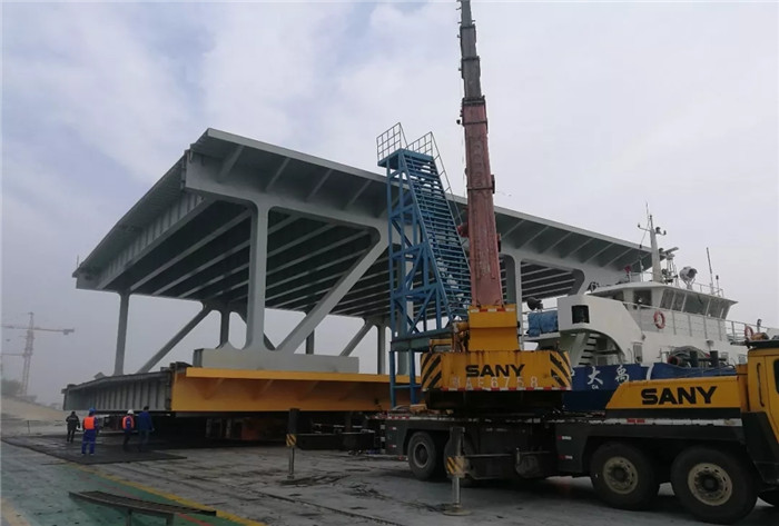 經過約1小時的緊張運行,梁段中線與船體中線重合,模塊車停止前進,微微對位調整后,早上6時58分,模塊車落墩就位。綁扎牢固后,盛暢7#解纜離岸,開足馬力,駛向楊泗港橋址。