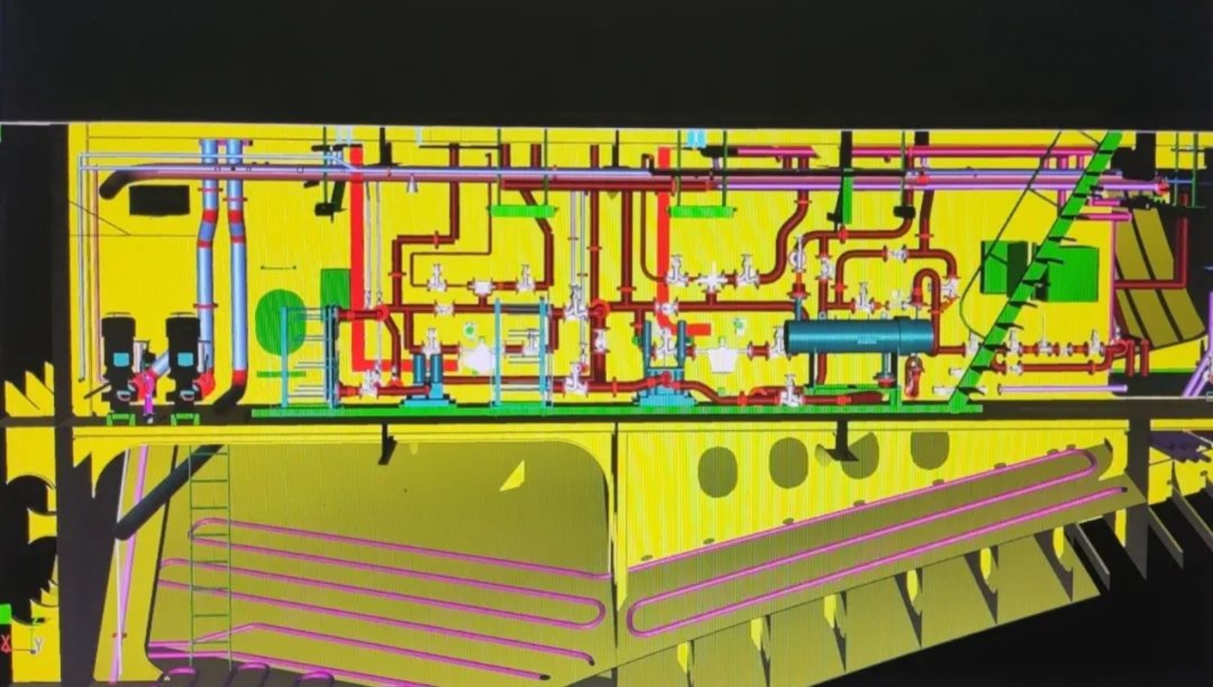 本項目船型是根據17500DWT化學品船優化而來,在主尺度未變的情況下增加了1000噸的裝載量,壓縮了機艙空間,而且采用了箱冷等設備,因而對于機艙布置提出較大挑戰,前期設計院18500DWT油化船設計團隊在與歐德利、設備廠家等進行多達近1000封郵件溝通,不斷優化機艙結構,經過9次改版,才使此次機艙三維綜合布置工作順利完成。