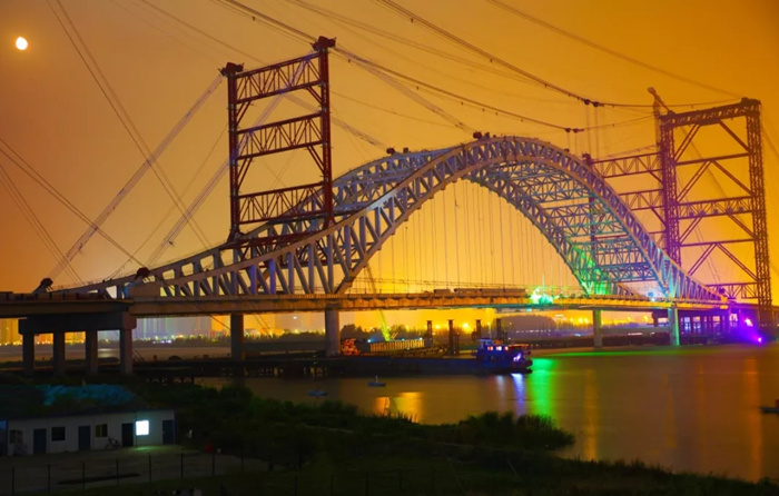 蘇嶺山大橋主拱在6月28日合龍后,武船重工股份項目部迅速啟動了主梁吊裝的工作,繼續發揮項目臨時黨支部的作用,迎難而上,先后克服了主梁安裝與臨時水平系桿安裝、吊桿安裝在高空交叉作業、體系轉換施工技術難度極大、因環保要求白天焊、割、刨作業被限制等重重困難,合理優化吊裝工藝、工序,組織開展了多項勞動競賽,將原來每個主梁節段吊裝時間從9小時優化到了6小時,從一天一吊優化到一天兩吊。在主橋合龍沖刺階段,武船重工股份后場梁段及時供應,同時加派施工人員連續作業,確保了最終合龍節點。