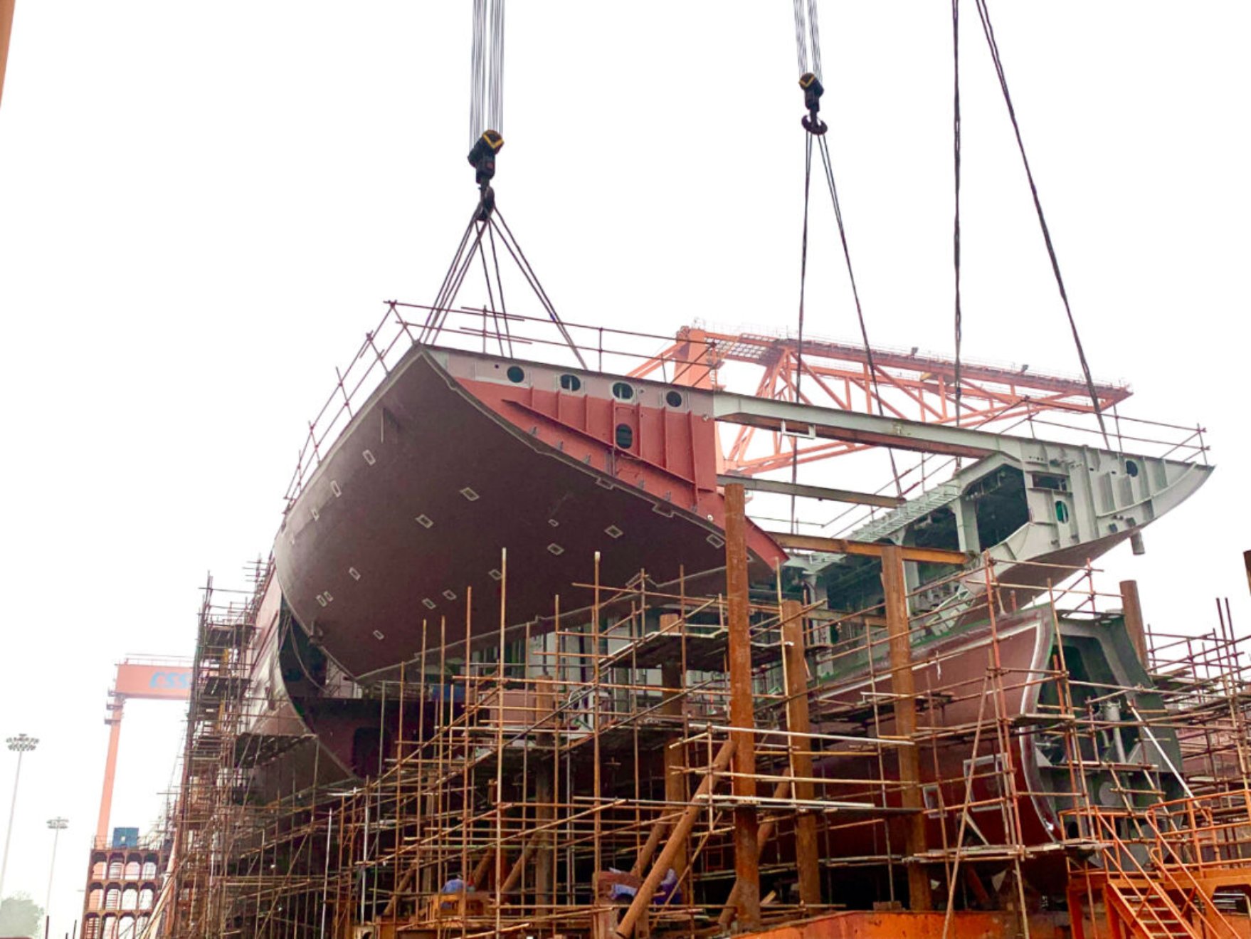 總組階段,項目組以總組完整性為目標,科學制定生產(chǎn)計劃,統(tǒng)籌優(yōu)勢資源,積極采取首部、中部、尾部及上建總組多線作戰(zhàn),齊頭并進的方式組織各專業(yè)同步施工,進一步提升建造效率,提前完成中部貨艙、上建總組等施工任務(wù),提前滿足上船臺節(jié)點要求。