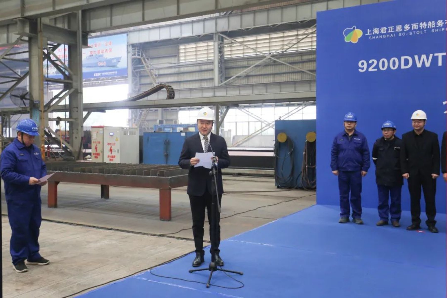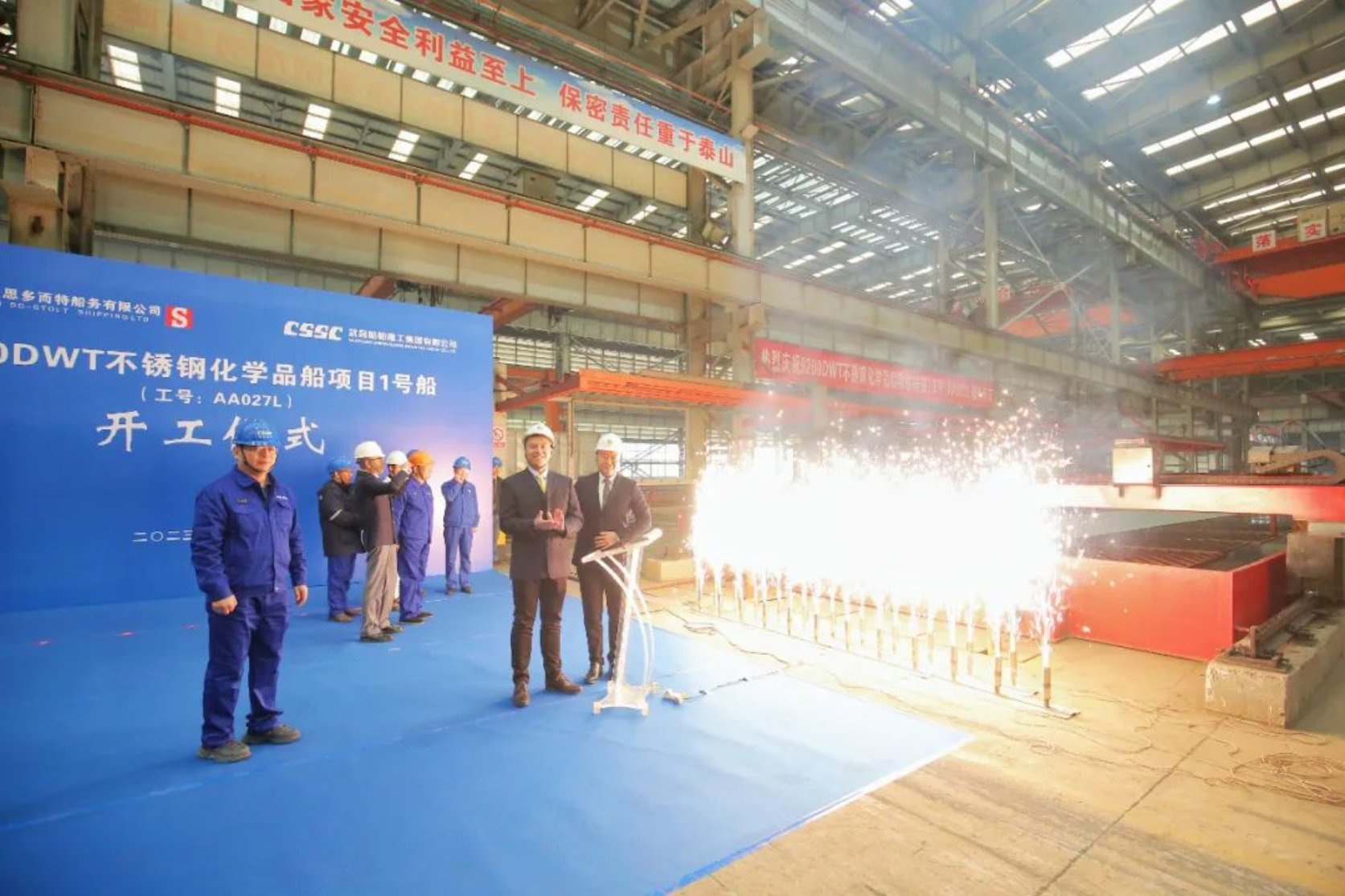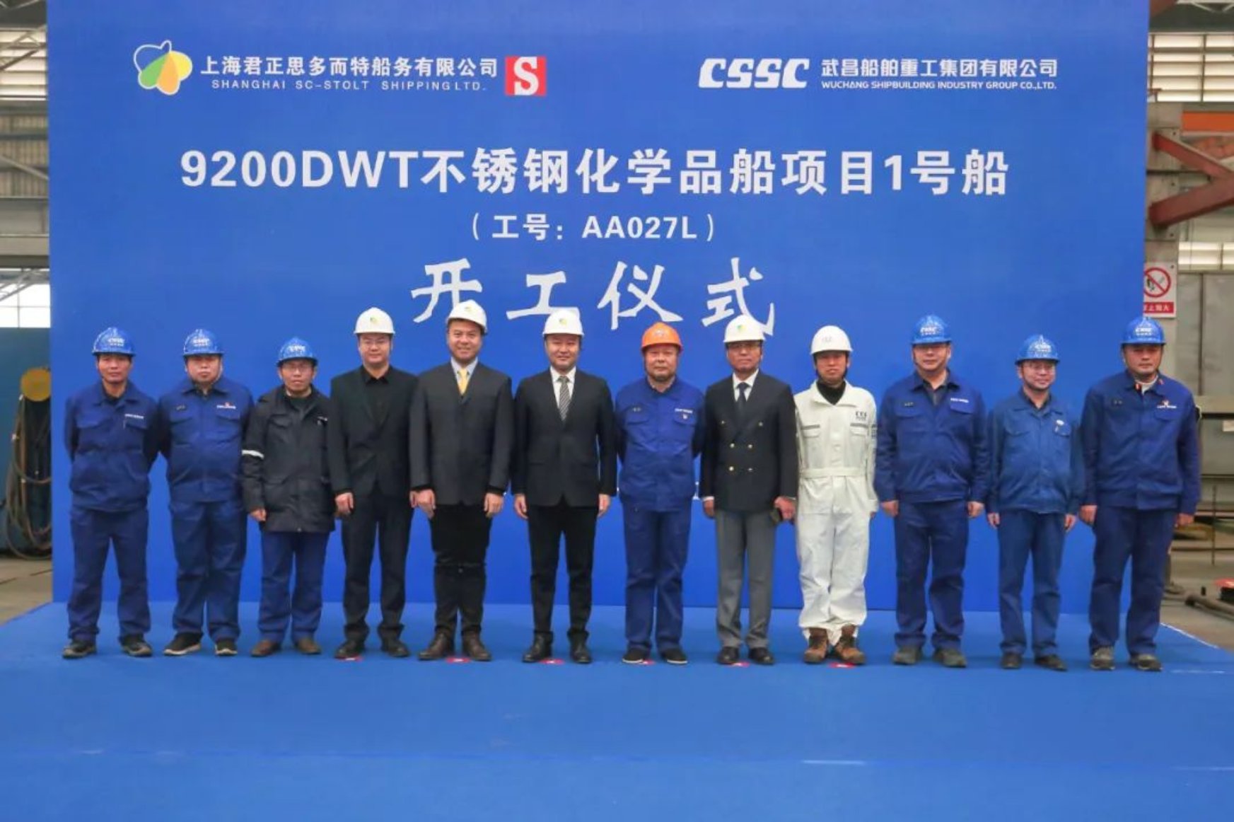 11月15日11點18分,由中國船舶集團武昌造船為上海君正思多而特船務有限公司建造的 9200DWT不銹鋼化學品船1號船 正式開工。上海君正思多而特船務有限公司總經理張華、副總經理鄭翼杰及現場監造團隊、中國船級社武漢分社、武昌造船等相關單位負責人參加開工儀式。