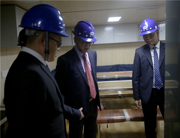 在有關負責人的陪同下,姚勝華重點檢查了該艦駕駛室、機艙、廚房、餐廳、臥室等主要區(qū)域,詳細了解當前各區(qū)域在實施過程中重點、難點,并針對一些疑難問題,提出解決方案。