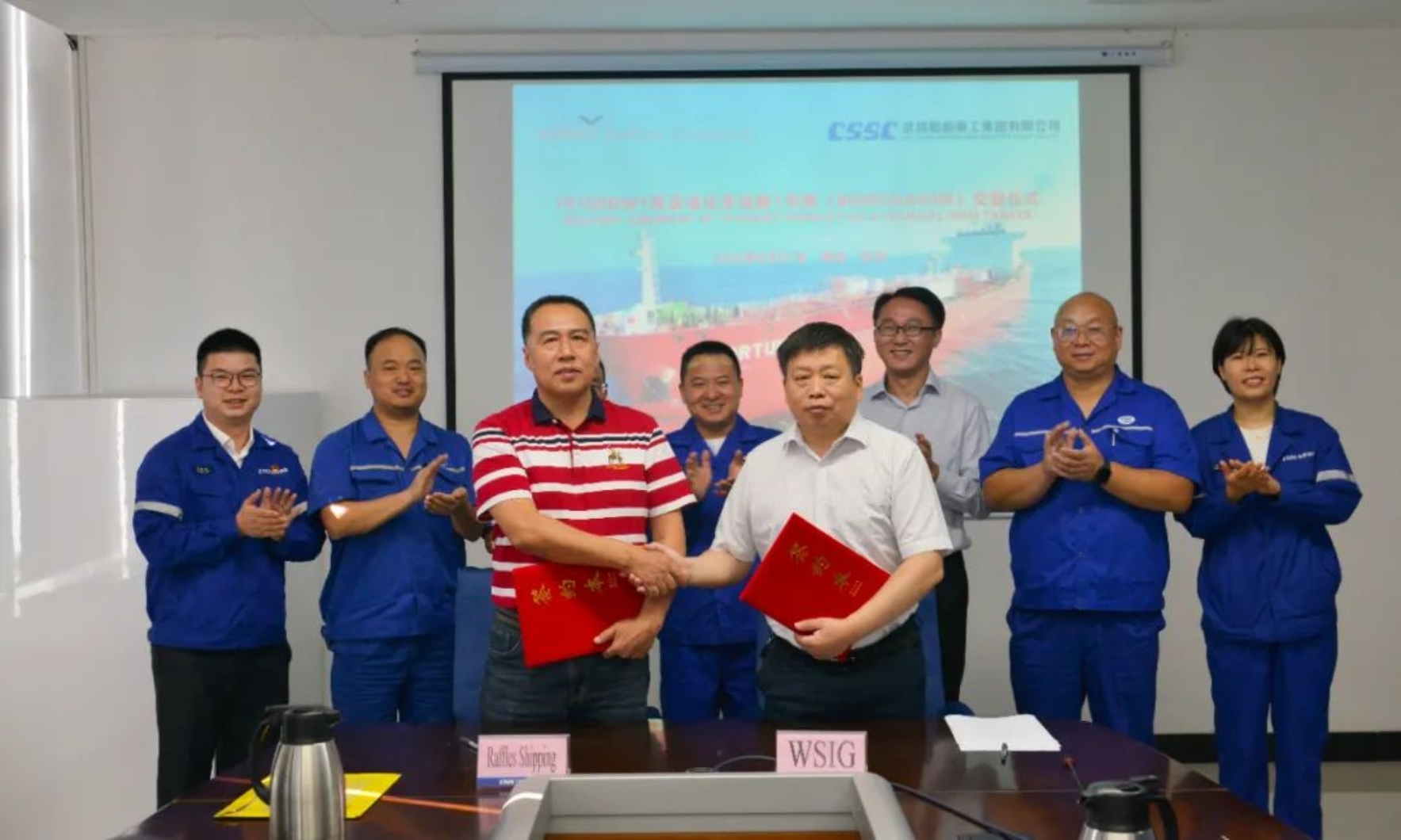 8月31日上午9時(shí),中國(guó)船舶集團(tuán)武昌造船為新加坡萊福士航運(yùn)集團(tuán)建造的 19700載重噸化學(xué)品船1號(hào)船 正式簽字交付!船東代表、上海富洋以及武昌造船的相關(guān)領(lǐng)導(dǎo)和嘉賓出席交船儀式。