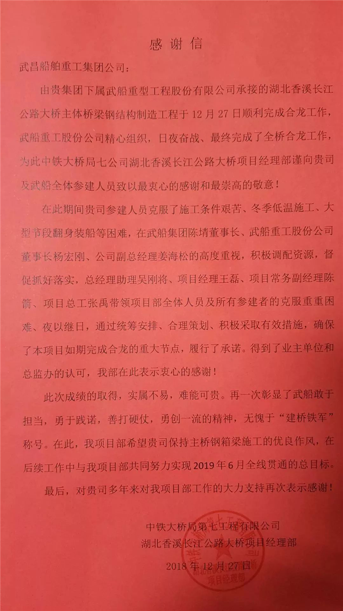 合龍儀式上,香溪長江大橋業主、總包單位對公司在大橋建設過程中表現的守信擔當、硬朗作風的工作作風表示高度贊揚,并向武船集團發來感謝信,同時希望公司能繼續保持優良作風,提前高效地完成后續工作任務。