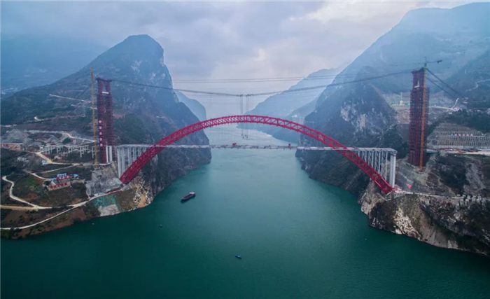 香溪長江公路大橋位于湖北宜昌秭歸兵書寶劍峽峽口,橋梁主跨531.2米,橋面寬32.3米,是目前世界最大跨度的鋼箱桁架推力拱橋,大橋在今年5月22日實現了主拱合龍,8月30日拱上立柱吊裝完成,隨后開始架設鋼主梁,主梁架設歷時約4個月。本次合龍段施工包括2根主縱梁、7根中縱梁、8根橫梁、2塊人行道板施工。