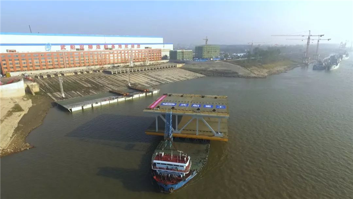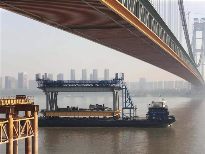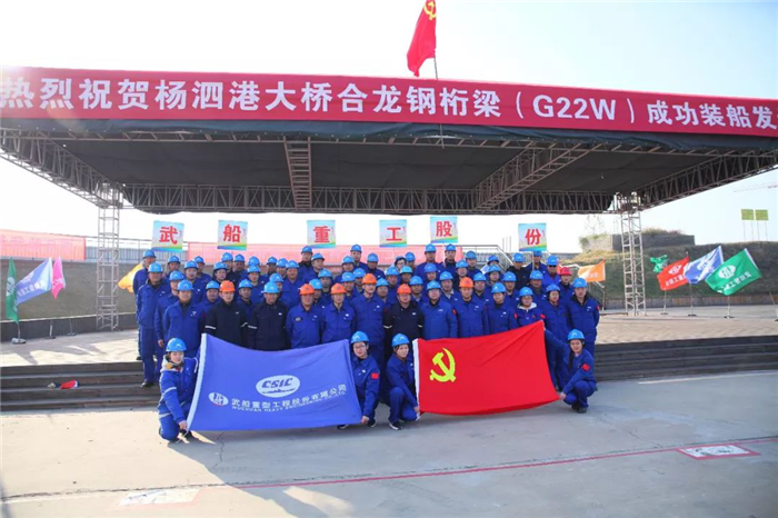 12月18日,世界最大跨度的雙層公路懸索橋?C?C楊泗港大橋合龍鋼桁梁在公司雙柳廠區裝船發運,這標志著由武船重工股份承建的楊泗港大橋全橋51節鋼桁梁節段已全部發運完畢。合龍鋼桁梁發運儀式在船臺舉行,武船重工股份總經理吳躍波,中船重工集團首席技術專家、武船重工股份總工程師阮家順,副總經理、工會主席姜海松,武船集團群團工作部、規劃部、雙柳武船、運輸單位和公司參建代表共計60余人參加儀式。