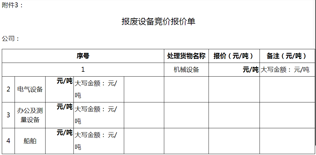 備注:機(jī)械設(shè)備、電氣設(shè)備、船舶、辦公及測(cè)量設(shè)備等四項(xiàng)內(nèi)容按照每噸的單價(jià)進(jìn)行報(bào)價(jià);