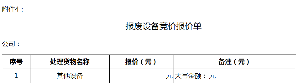 (2)報(bào)價(jià)要求:按附件3“報(bào)廢設(shè)備競(jìng)價(jià)報(bào)價(jià)單”的機(jī)械設(shè)備、電氣設(shè)備、船舶、辦公及測(cè)量設(shè)備等四項(xiàng)內(nèi)容,以及附件4“報(bào)廢設(shè)備競(jìng)價(jià)報(bào)價(jià)單”的其他設(shè)備分別填寫第一次報(bào)價(jià),原則上單項(xiàng)最高報(bào)價(jià)中標(biāo);若兩個(gè)及以上投標(biāo)商在同一競(jìng)價(jià)項(xiàng)目的價(jià)格相同且為本次競(jìng)價(jià)的最高報(bào)價(jià),則對(duì)該項(xiàng)目重新進(jìn)行現(xiàn)場(chǎng)報(bào)價(jià);若投標(biāo)商愿意以更高價(jià)格收購(gòu),可進(jìn)行多次現(xiàn)場(chǎng)競(jìng)價(jià),最終確定最高中標(biāo)價(jià)格和中標(biāo)方。
